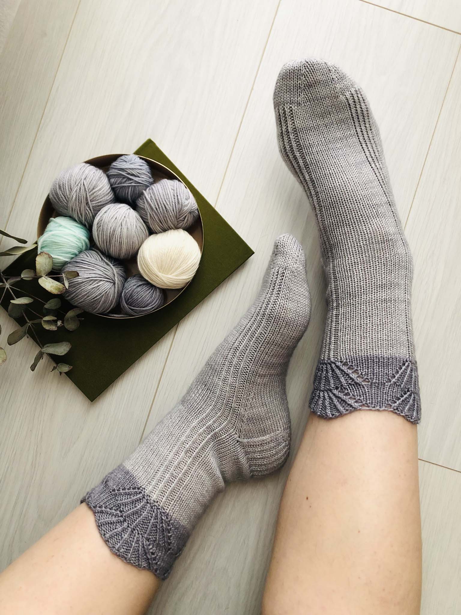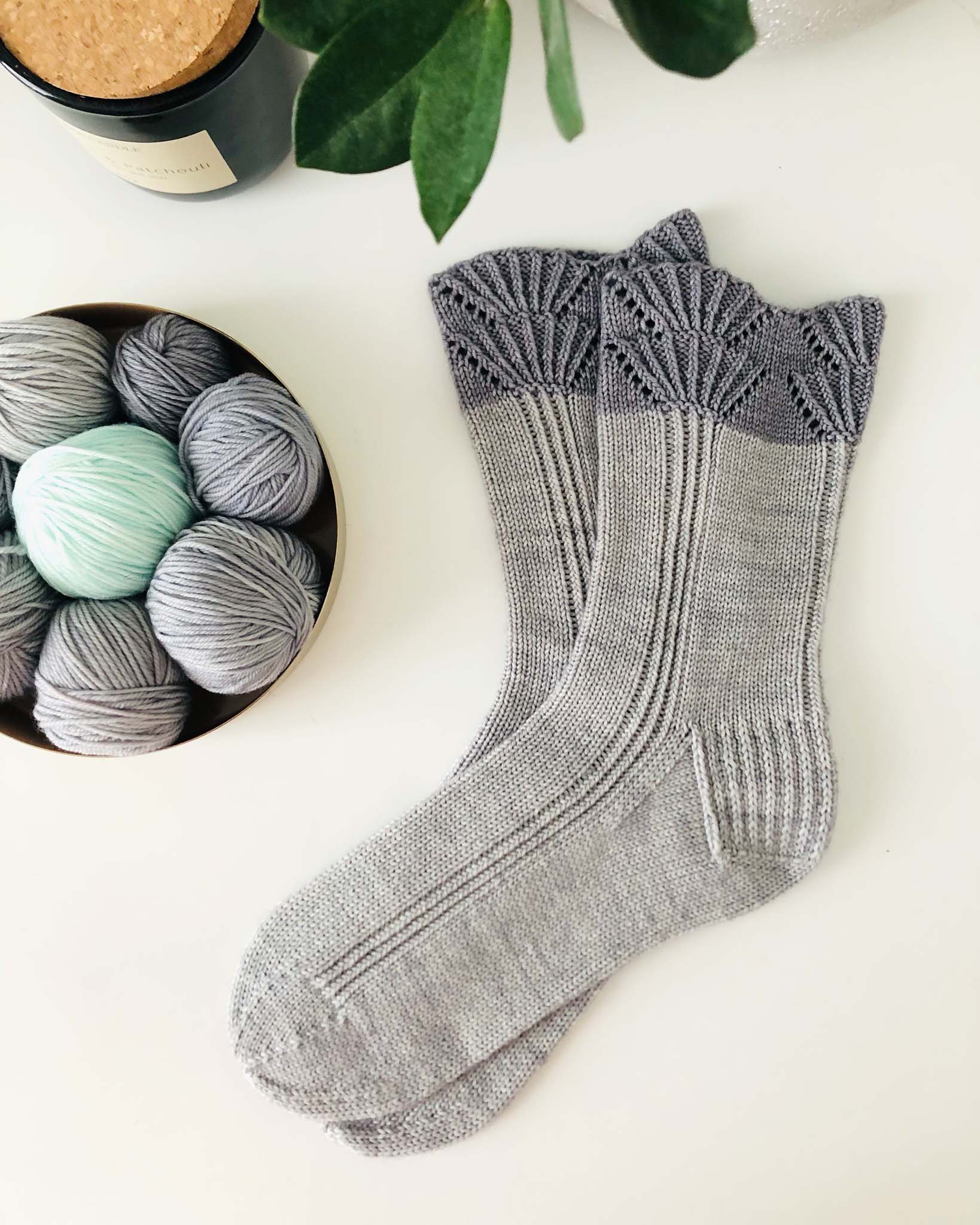Pigneto socks are knitted cuff down. The cuff features a beautiful shell-like lace pattern using twisted stitches.