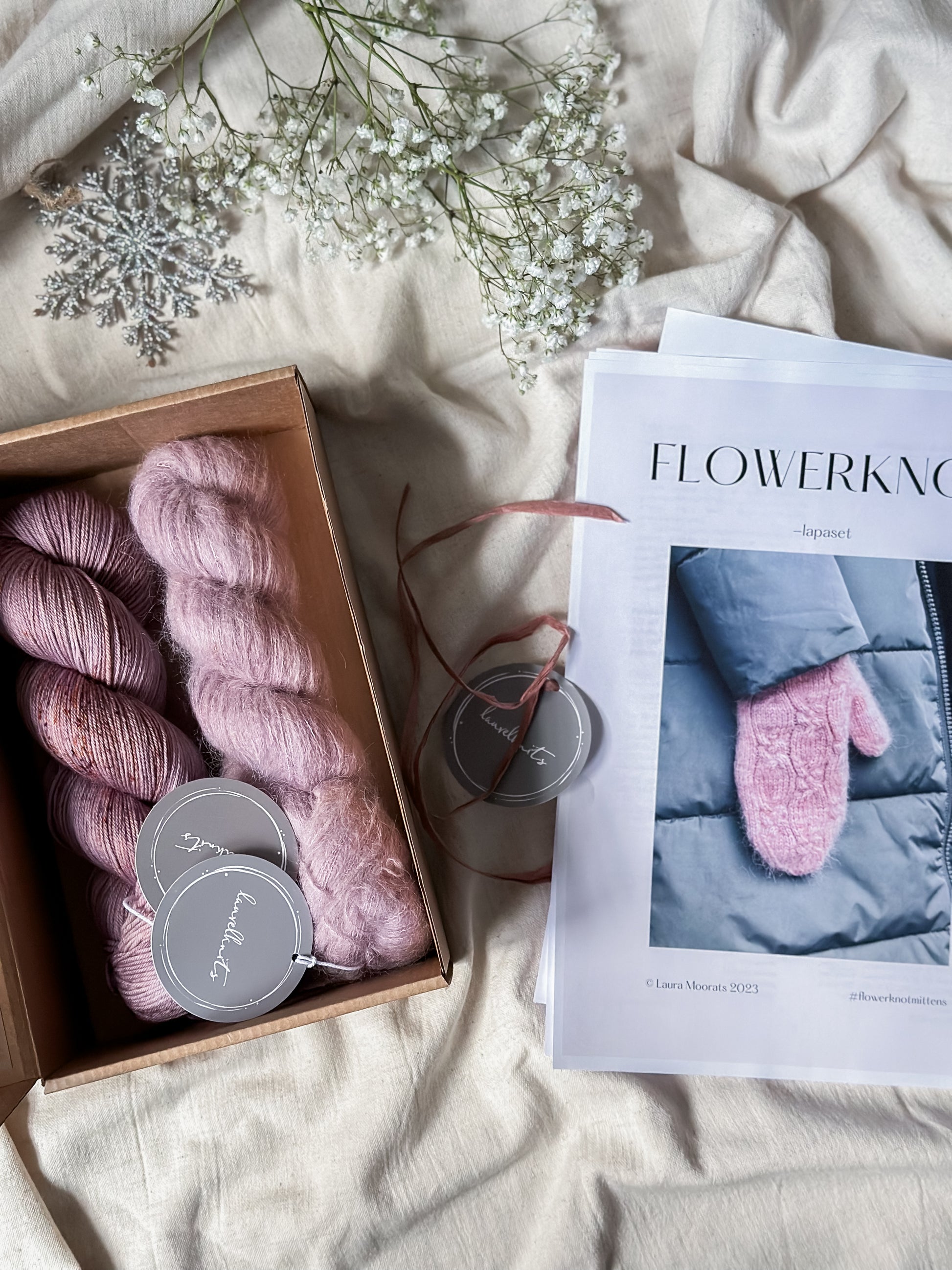 Gift box containing one 100g skein of SuperSock (85% SW Merino / 15% Nylon; 400m/100g), one 50g skein of Udu (75% Brushed Suri Alpaca / 25% Mulberry Silk; 300m/50g) and a paper version of Flowerknot Mittens knitting pattern.